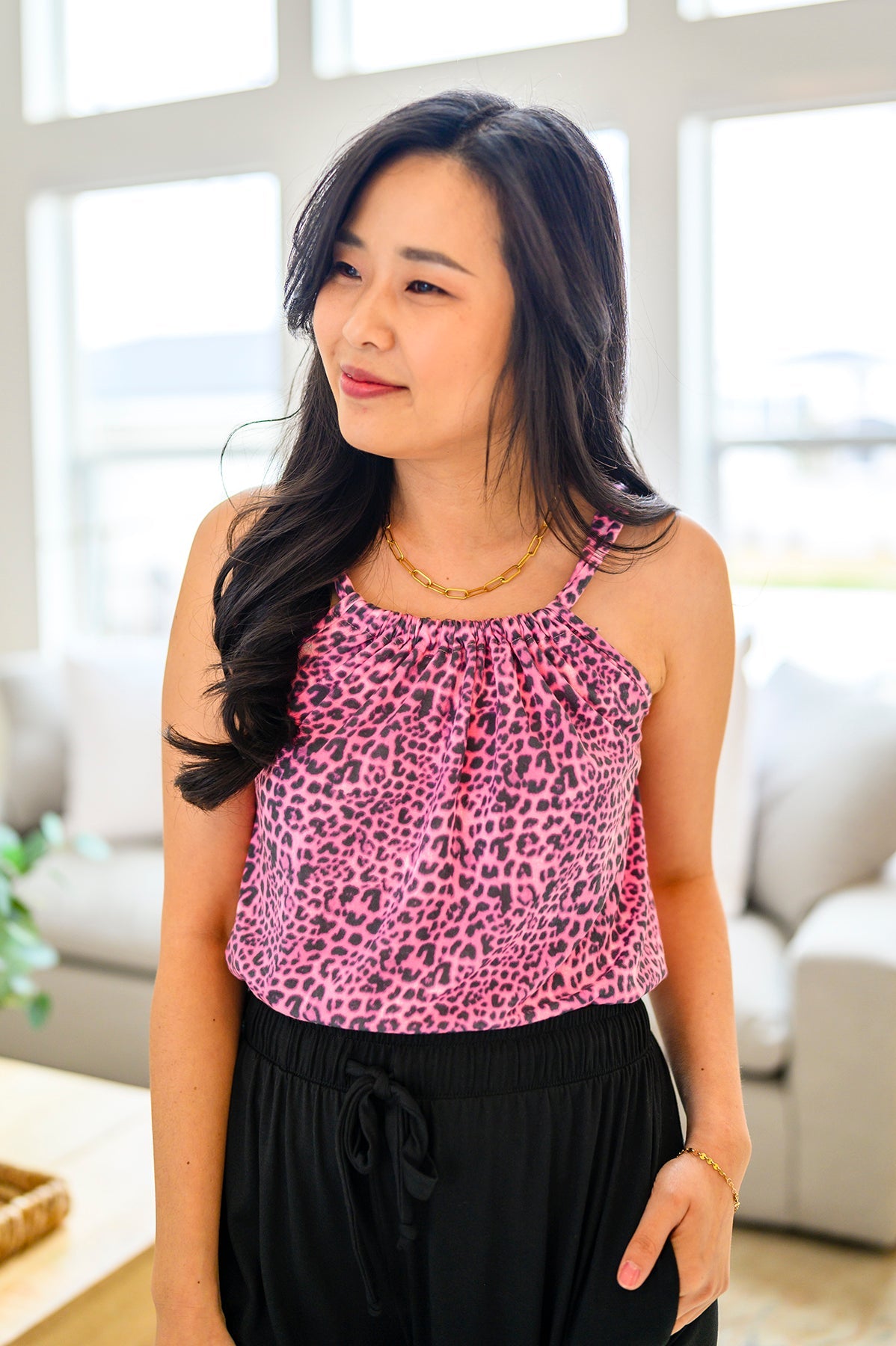 Ready to give ’em something to talk about? The A Little Chit Chat Tank is just the thing! Featuring a gathered halter neckline, an adjustable tie closure at the back, and a fun pink animal print, this flirty tank will make heads turn! Get ready for a little extra attention.