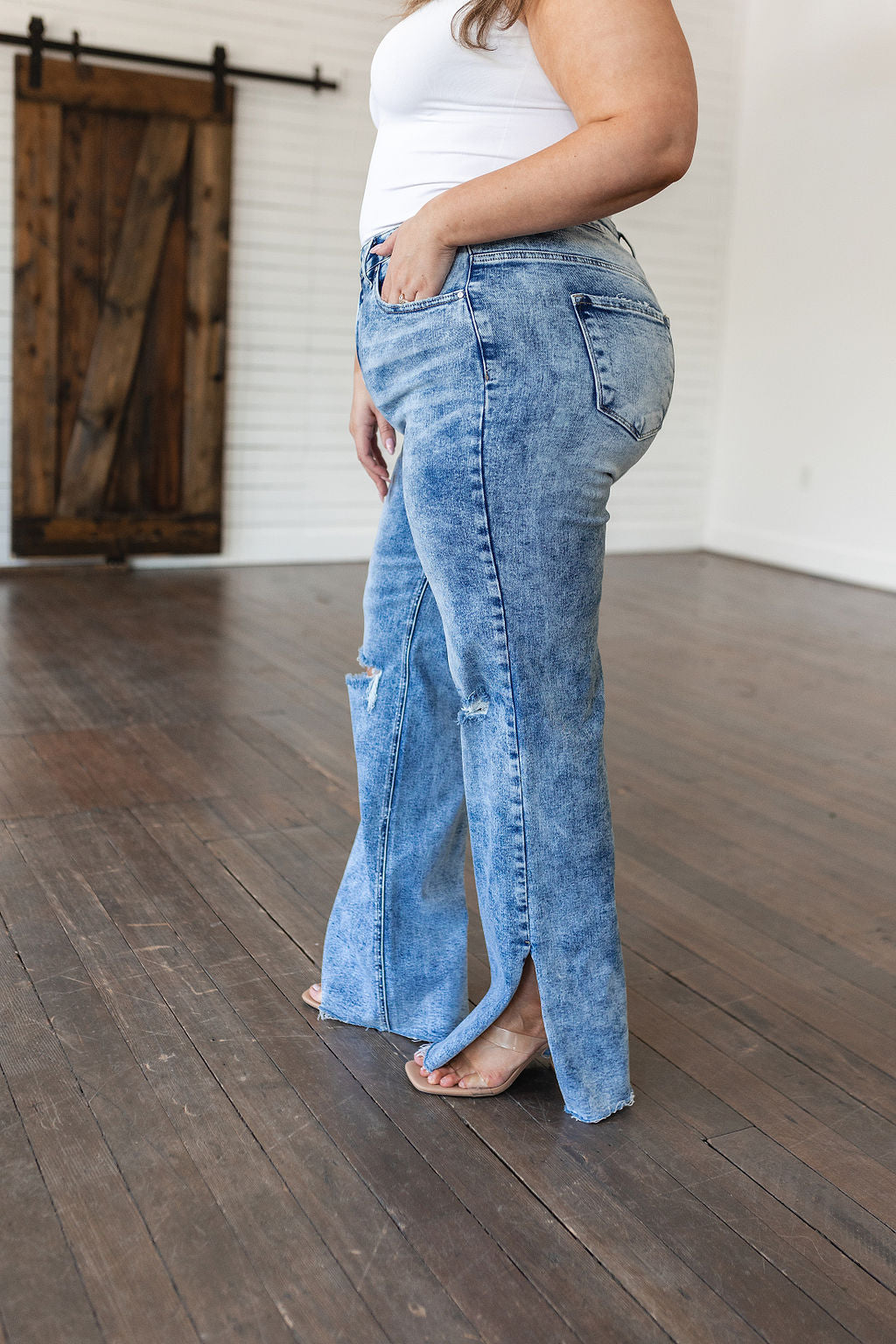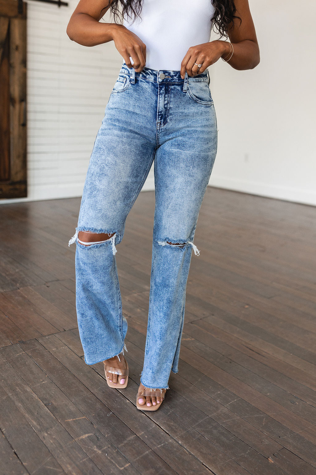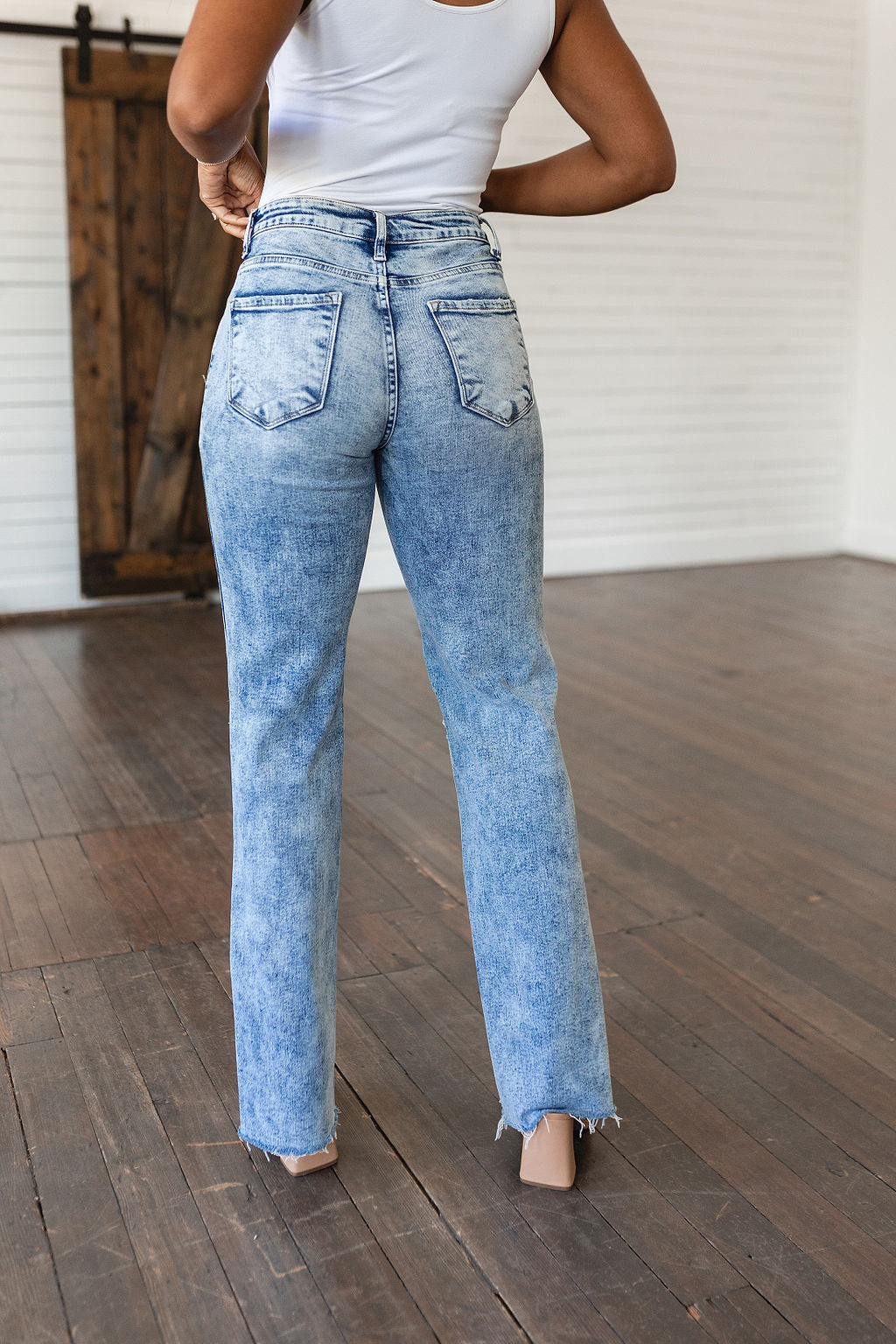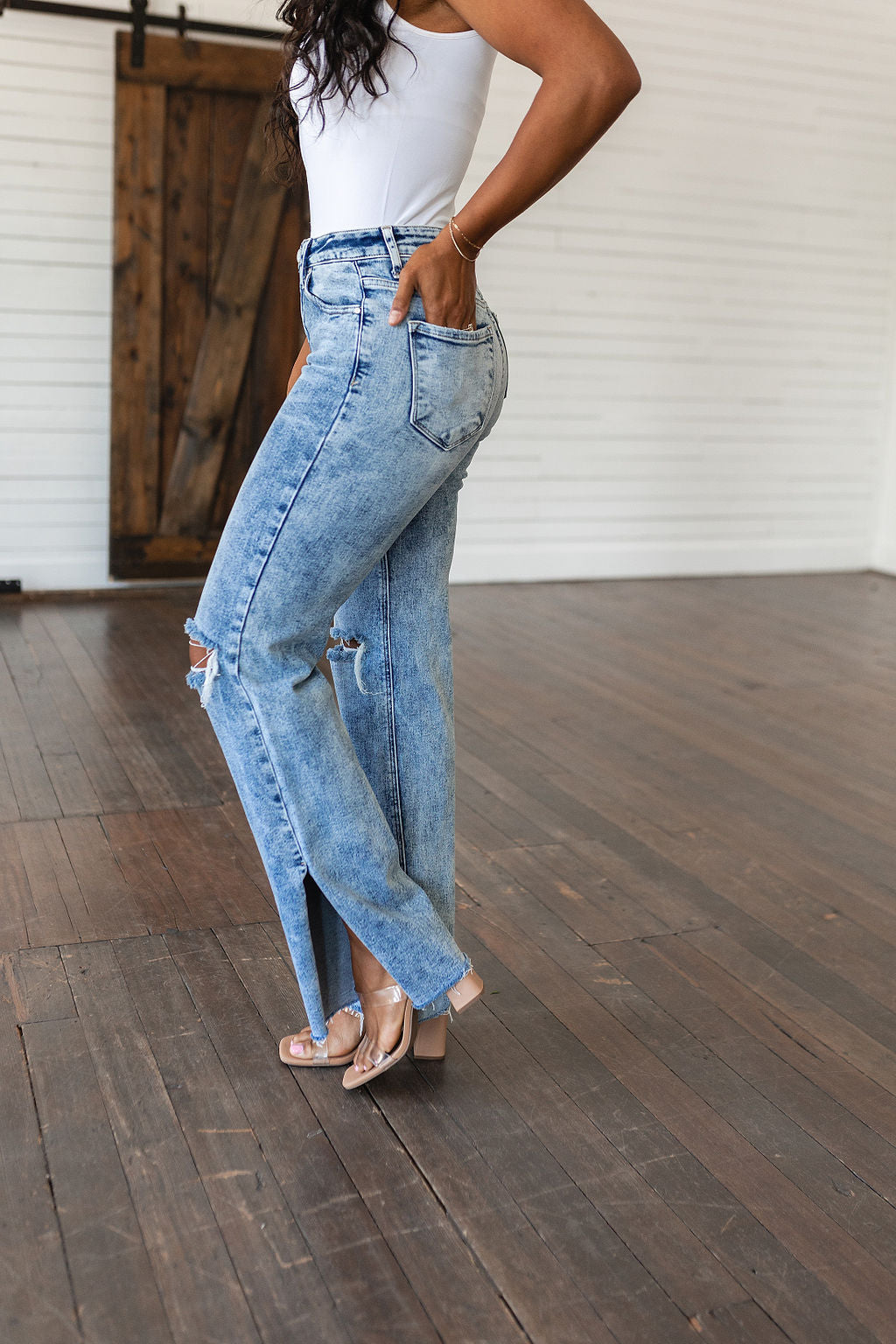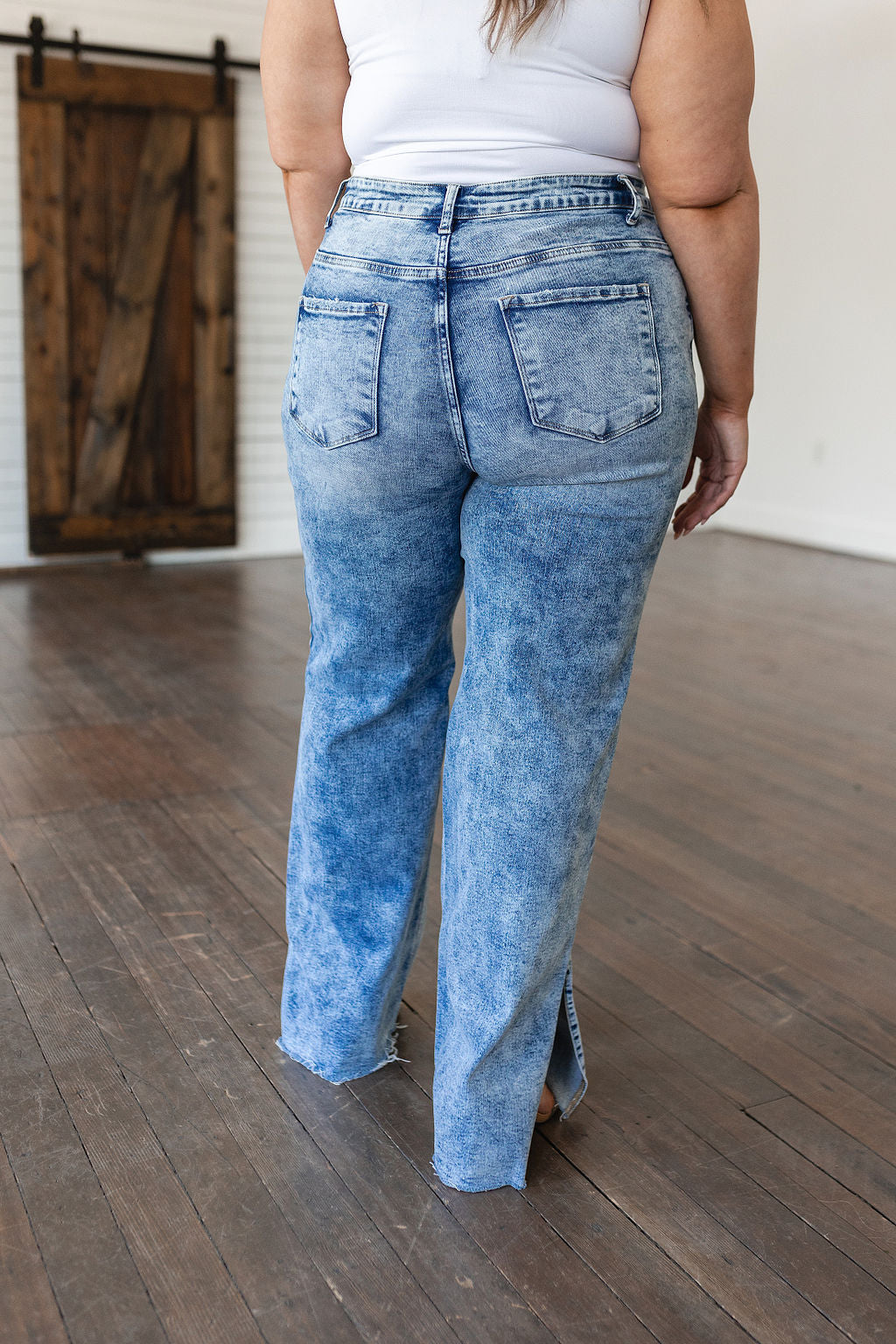 Carter High Rise Slit Hem Straight Jeans take denim to the next level with a fashionable acid-wash finish, side slits, raw hem, and distressed knee. Stylish yet comfortable, this high-rise jeans design is perfect for the modern fashionista.