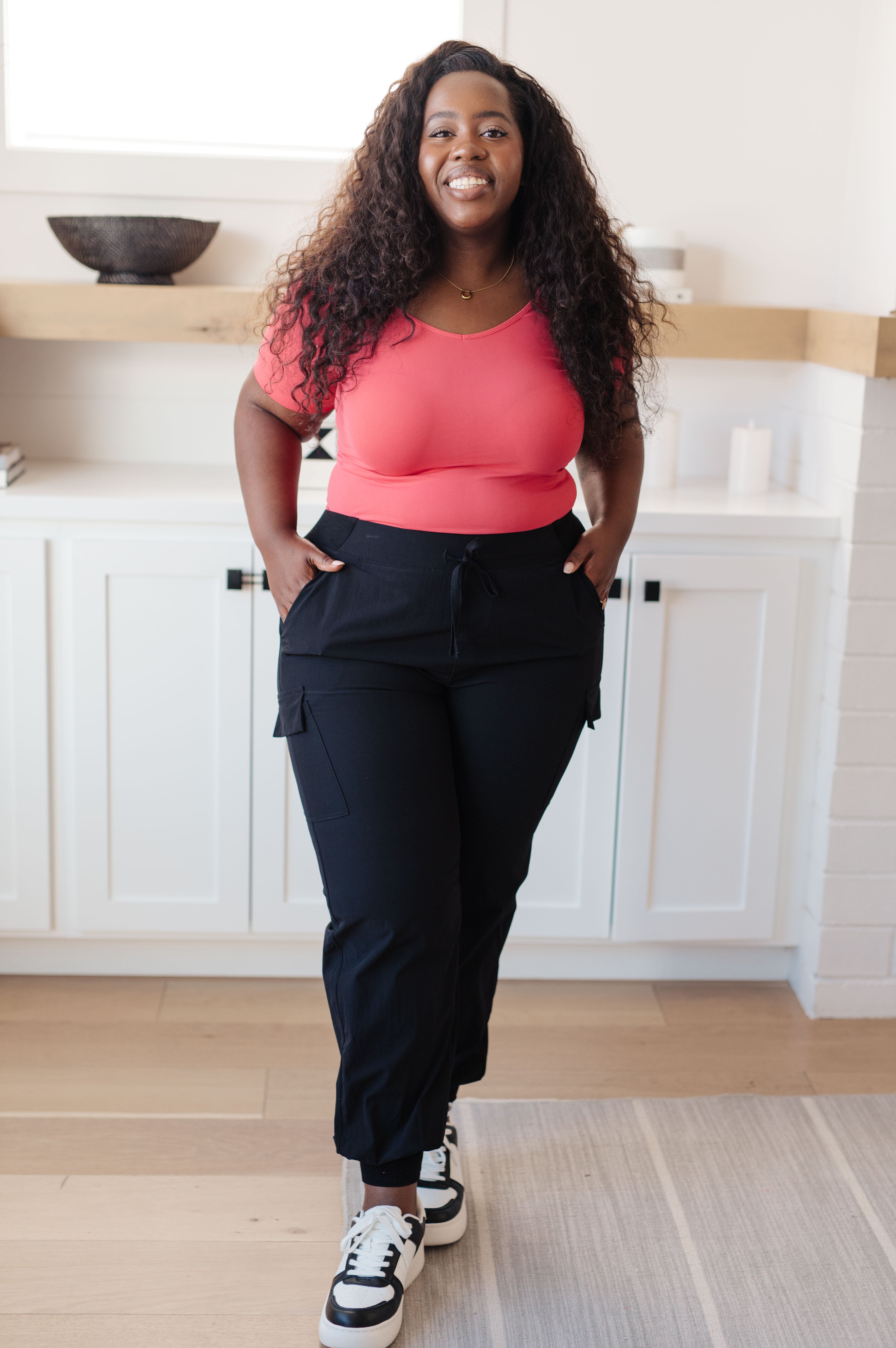 Our Dedicated To The Task Joggers will keep you going all day with a ribbed knit waistband, zipper pocket in back, and cargo pockets. Made with lightweight nylon fabric, you will stay comfortable and stylish in this jogger silhouette.