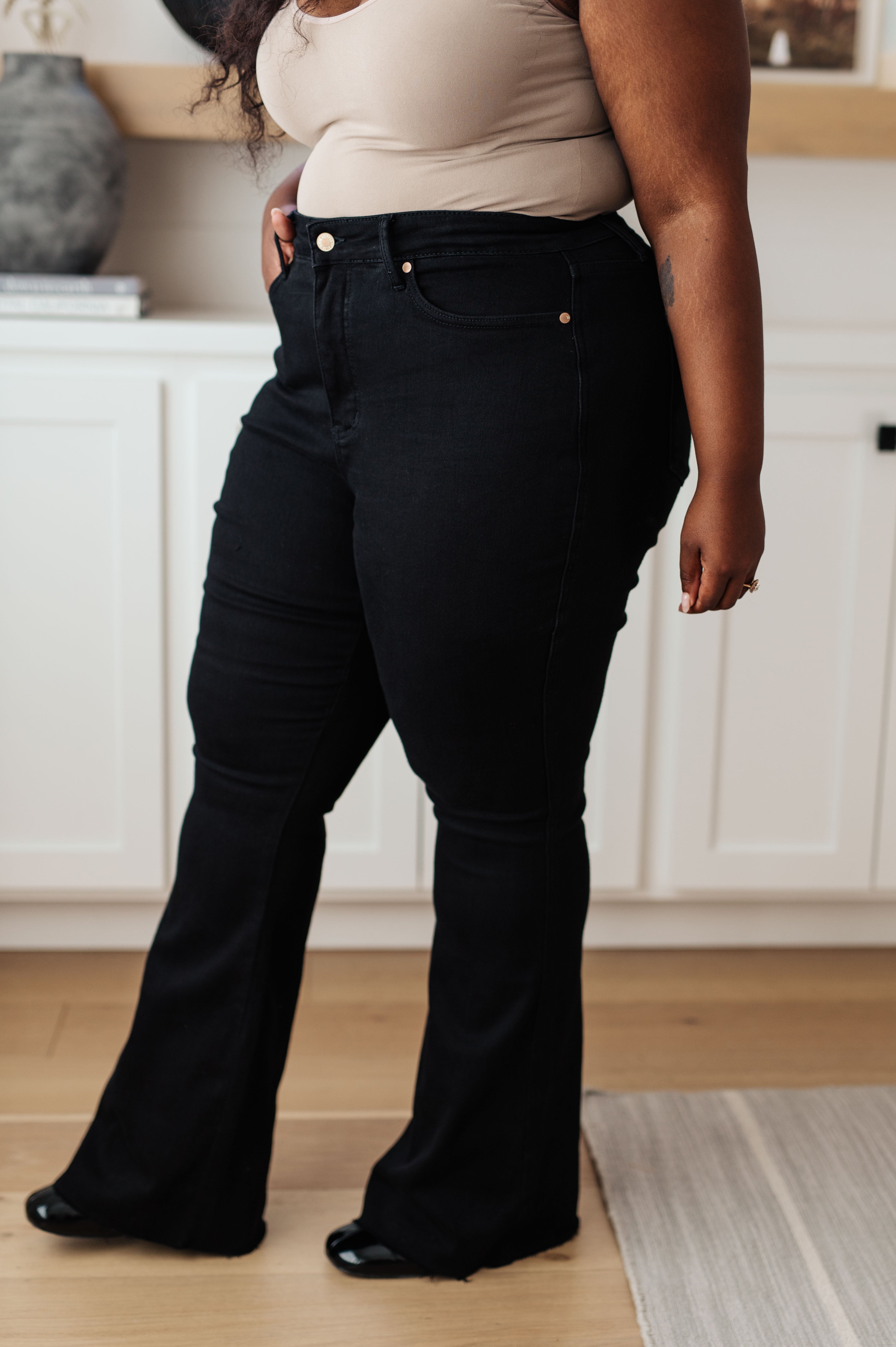 These Etta High Rise Control Top Flare Jeans from Judy Blue are perfect for achieving a sleek and stylish silhouette. The tummy control tech and raw hem give you signature style in a saturated black wash. Dress them up or down for effortless fashion.