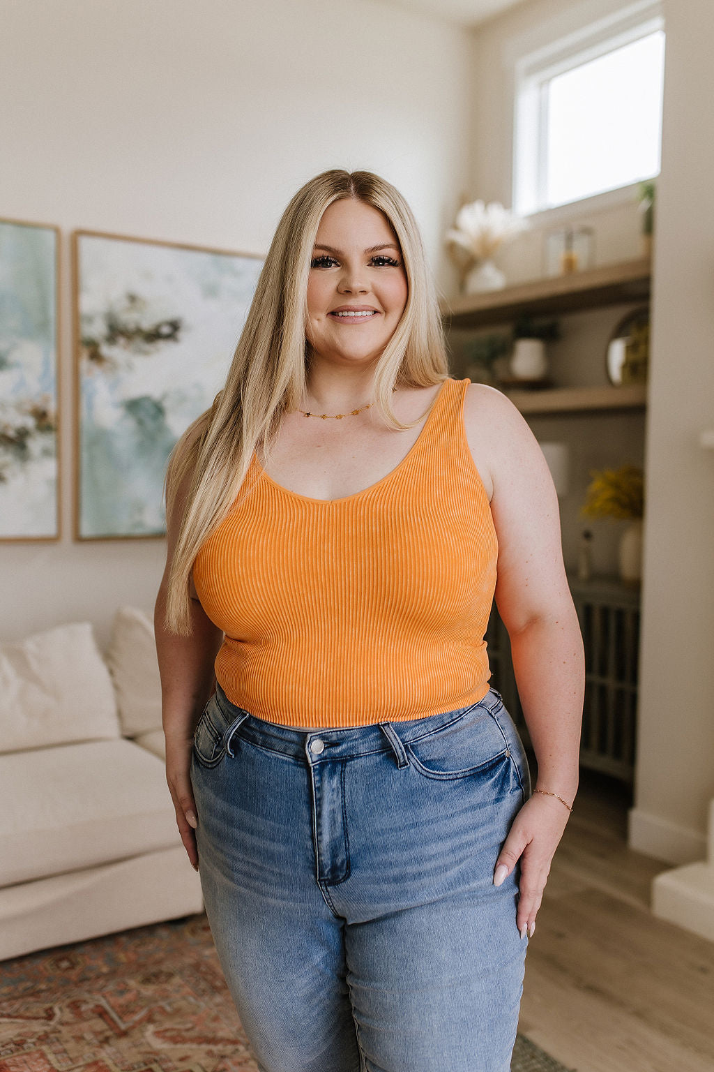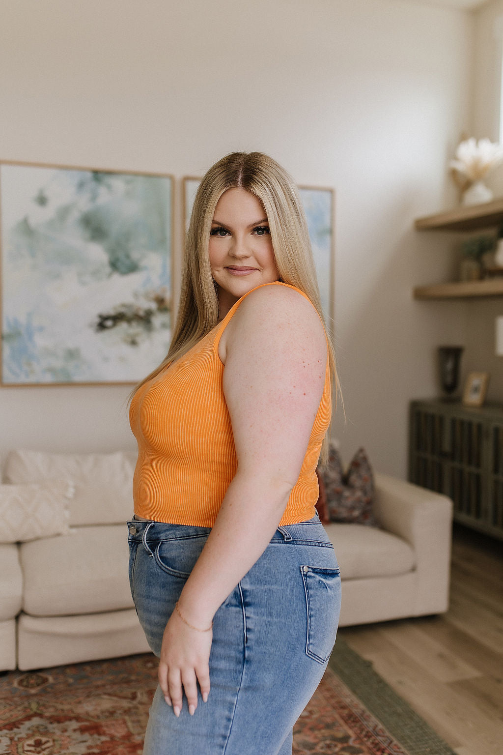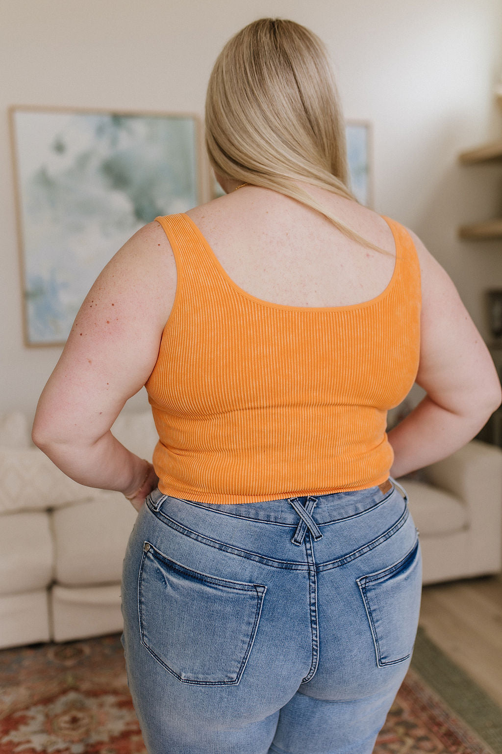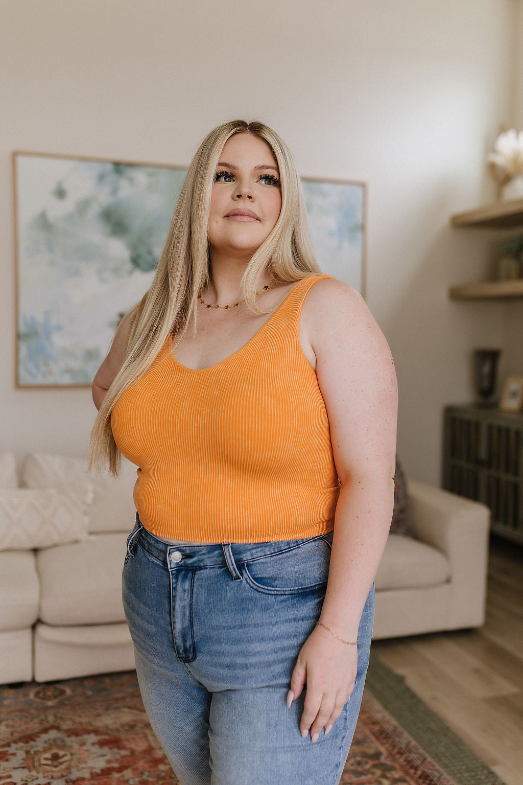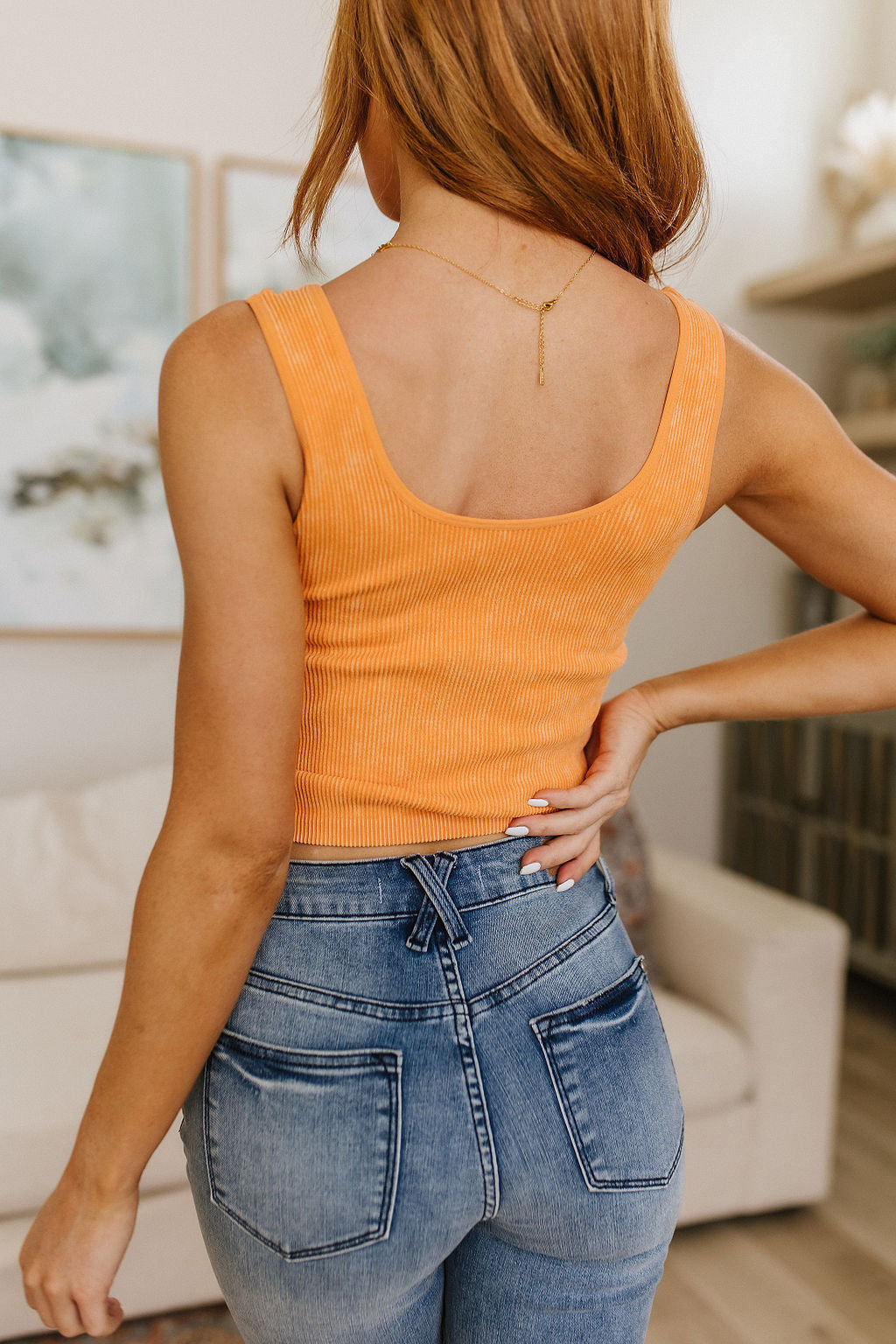 This tank is the perfect combination of function and fashion. Crafted from ribbed fabric with a seamless finish, it offers a flattering, cropped fit that can be customized with your choice of v-neck or scoop neck. Plus, its mineral wash makes it a true stand-out piece.