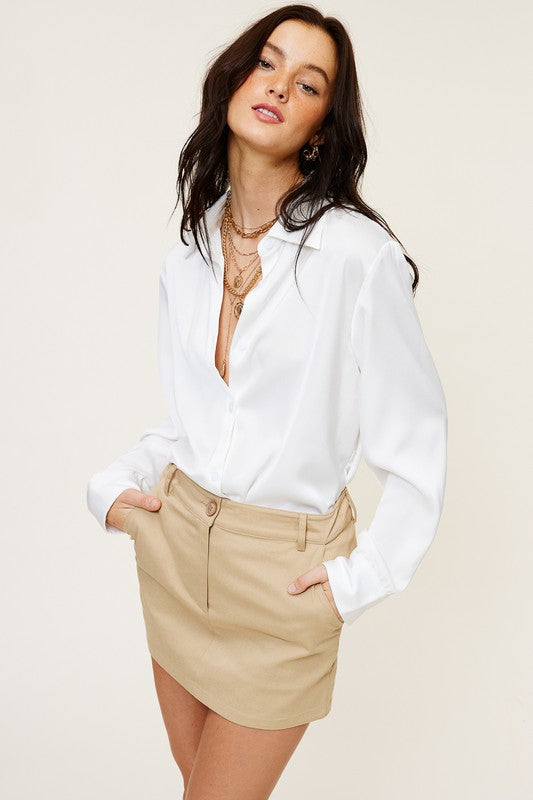 This silky button-down top is perfectly paired with jeans, shorts, and high heels or sneakers! Wear it open with a tank or bralette, or closed with a statement necklace!